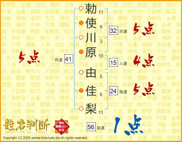 勅(11画)使(8画)川(3画)原(10画) 由(5画)佳(8画)梨(11画)