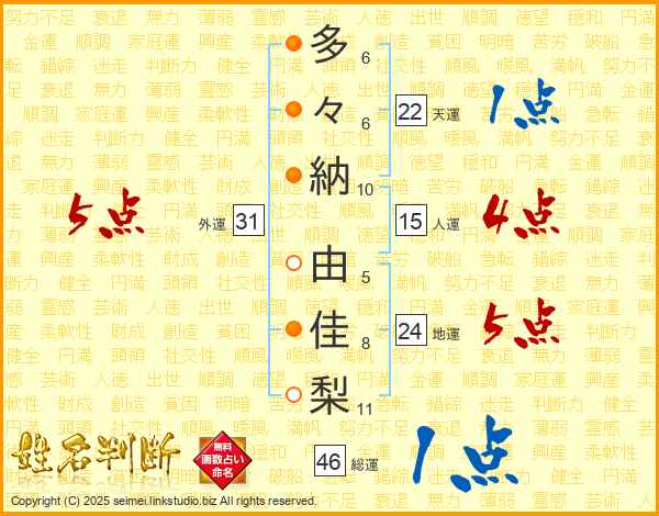 多(6画)々(6画)納(10画) 由(5画)佳(8画)梨(11画)
