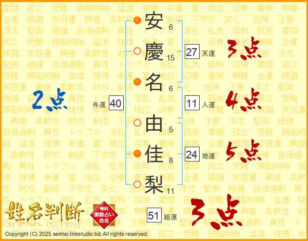 安(6画)慶(15画)名(6画) 由(5画)佳(8画)梨(11画)