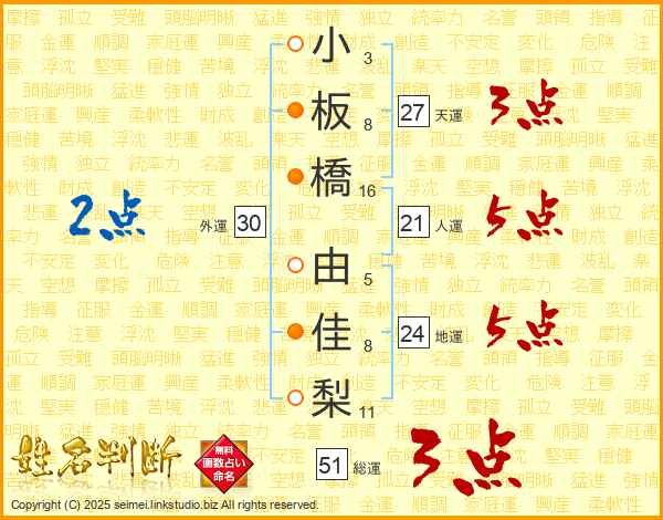 小(3画)板(8画)橋(16画) 由(5画)佳(8画)梨(11画)