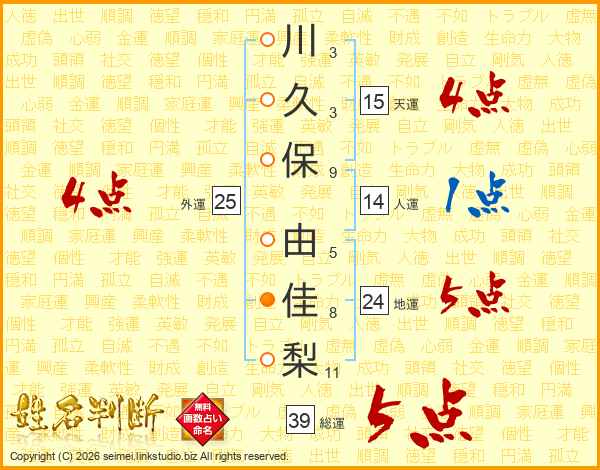 川(3画)久(3画)保(9画) 由(5画)佳(8画)梨(11画)