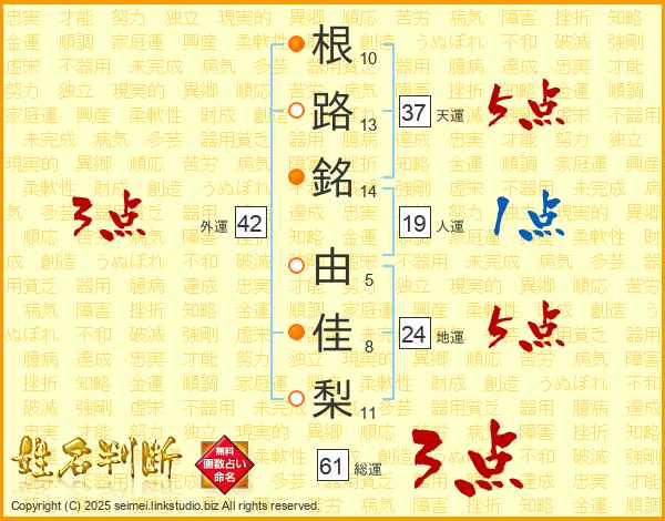 根路銘由佳梨さんの天運は37画の5点!