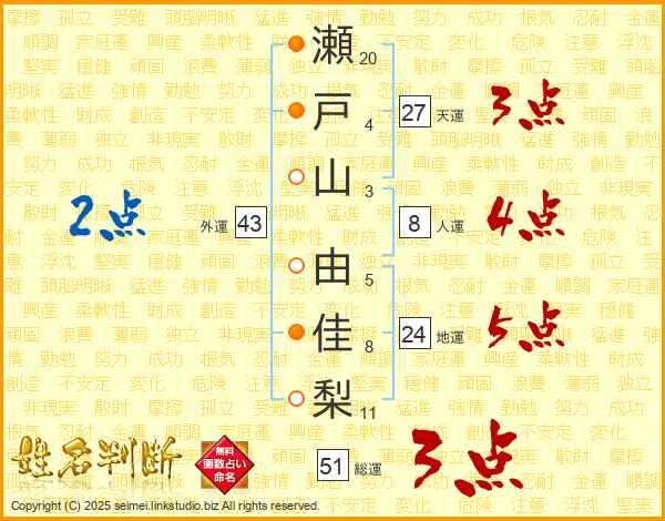 瀬(20画)戸(4画)山(3画) 由(5画)佳(8画)梨(11画)