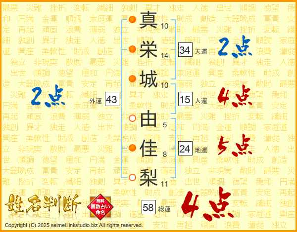 真(10画)栄(14画)城(10画) 由(5画)佳(8画)梨(11画)