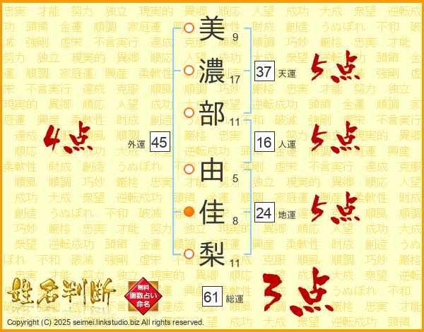 美(9画)濃(17画)部(11画) 由(5画)佳(8画)梨(11画)