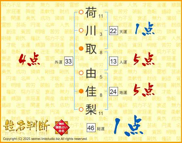 荷川取由佳梨さんの外運は33画の4点!