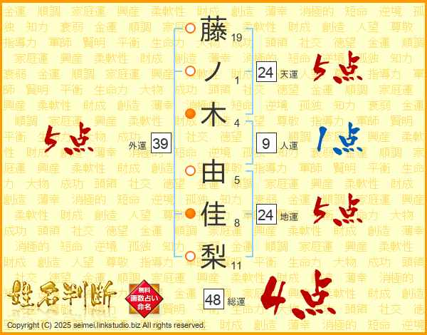 藤(19画)ノ(1画)木(4画) 由(5画)佳(8画)梨(11画)