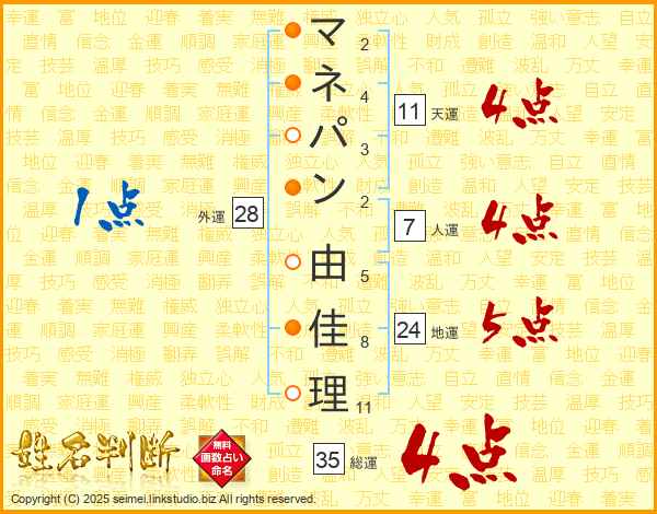 マ(2画)ネ(4画)パ(3画)ン(2画) 由(5画)佳(8画)理(11画)