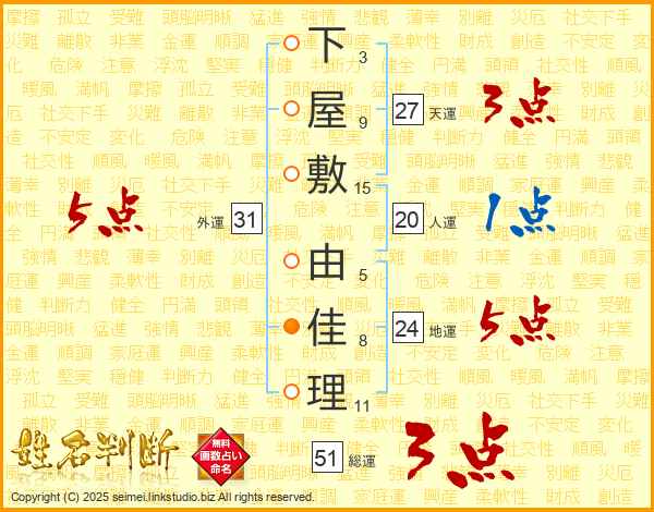 下(3画)屋(9画)敷(15画) 由(5画)佳(8画)理(11画)