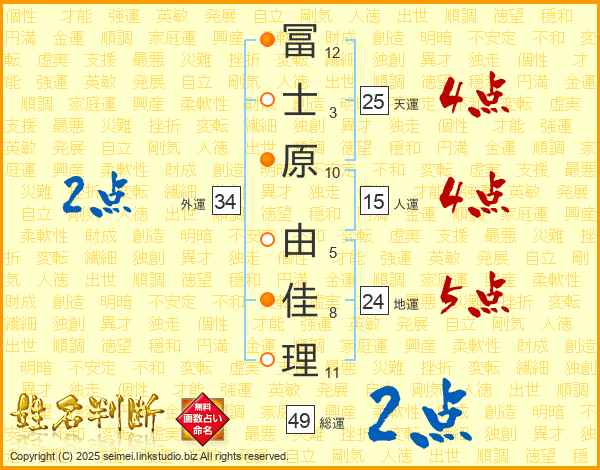 冨(12画)士(3画)原(10画) 由(5画)佳(8画)理(11画)
