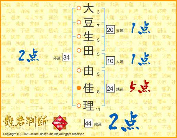大(3画)豆(7画)生(5画)田(5画) 由(5画)佳(8画)理(11画)