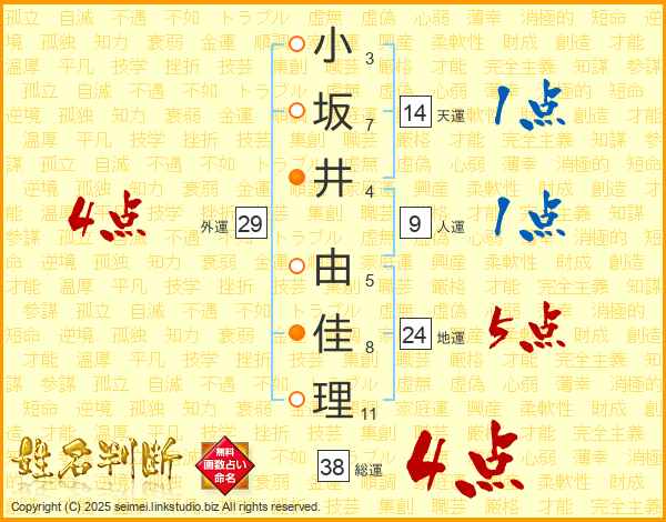 小(3画)坂(7画)井(4画) 由(5画)佳(8画)理(11画)