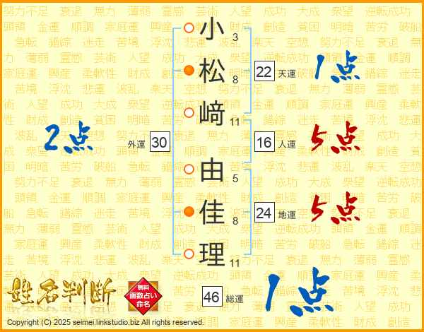 小(3画)松(8画)﨑(11画) 由(5画)佳(8画)理(11画)