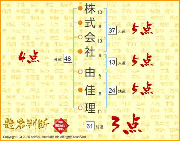 株式会社由佳理さんの天運は37画の5点