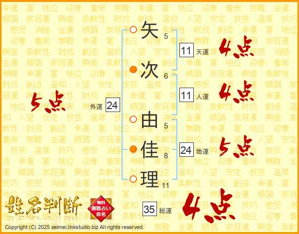 矢(5画)次(6画) 由(5画)佳(8画)理(11画)