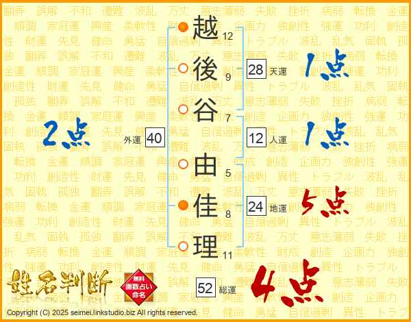 越(12画)後(9画)谷(7画) 由(5画)佳(8画)理(11画)
