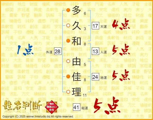 生活面を象徴する運勢です。外部から受ける影響力を表し、結婚運、家庭運や職場、環境への順応性を表します。総運から人運を引いた画数。姓や名が1文字の場合を除く。