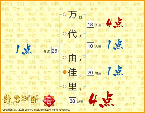 万(13画)代(5画) 由(5画)佳(8画)里(7画)