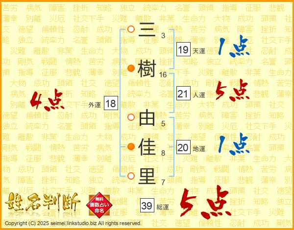 三(3画)樹(16画) 由(5画)佳(8画)里(7画)