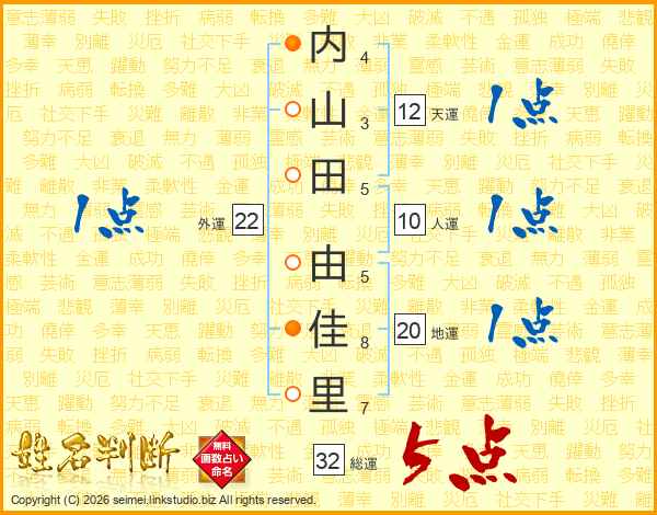 内(4画)山(3画)田(5画) 由(5画)佳(8画)里(7画)