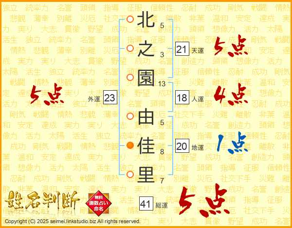 北(5画)之(3画)園(13画) 由(5画)佳(8画)里(7画)