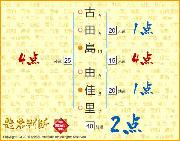古(5画)田(5画)島(10画) 由(5画)佳(8画)里(7画)