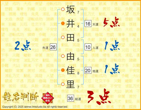 坂(7画)井(4画)田(5画) 由(5画)佳(8画)里(7画)