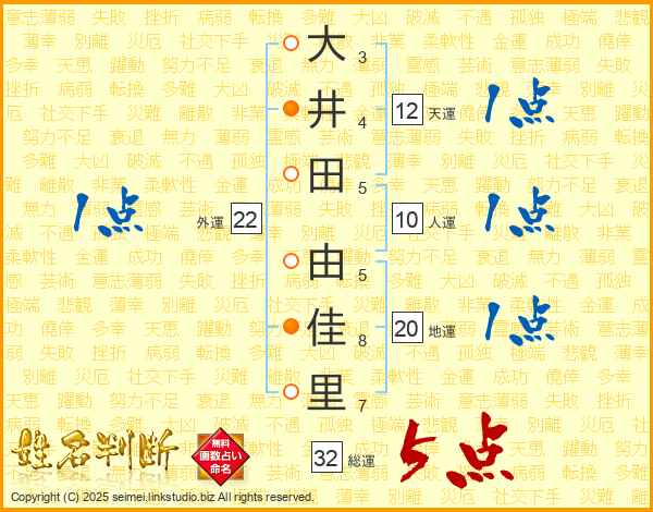 大(3画)井(4画)田(5画) 由(5画)佳(8画)里(7画)