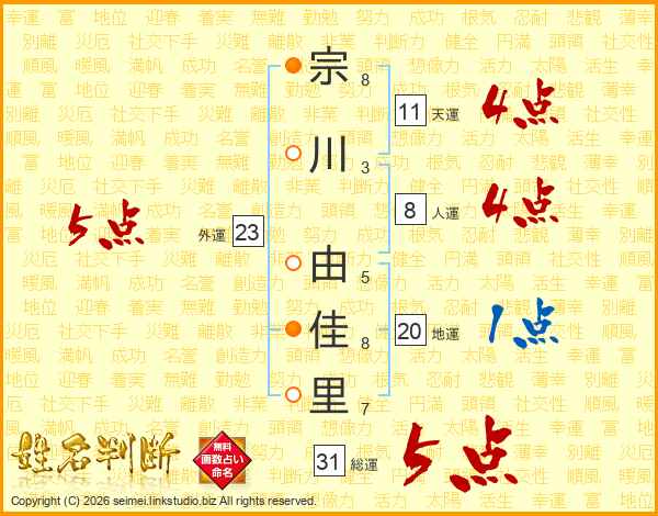 宗川由佳里さんの総運は31画の5点!