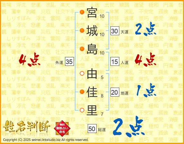 宮(10画)城(10画)島(10画) 由(5画)佳(8画)里(7画)
