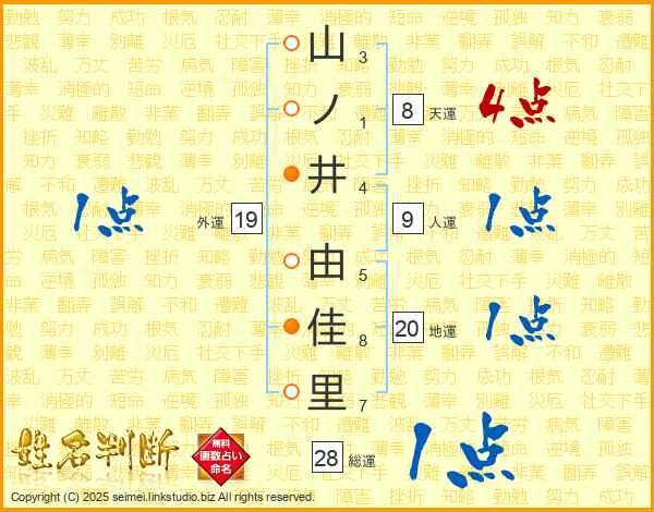 山(3画)ノ(1画)井(4画) 由(5画)佳(8画)里(7画)
