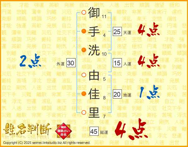 御(11画)手(4画)洗(10画) 由(5画)佳(8画)里(7画)