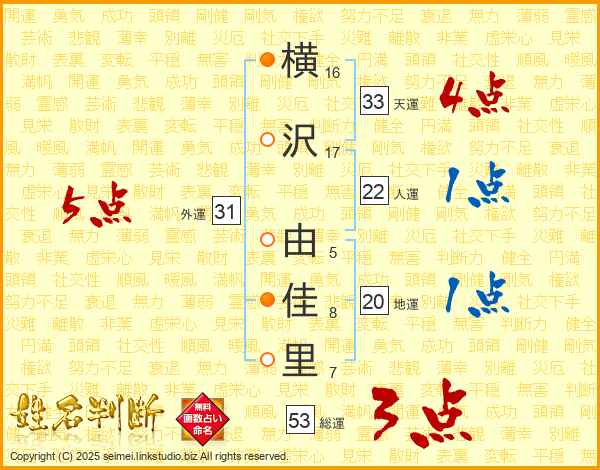 横(16画)沢(17画) 由(5画)佳(8画)里(7画)