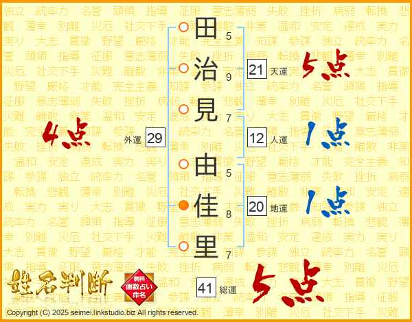 田(5画)治(9画)見(7画) 由(5画)佳(8画)里(7画)