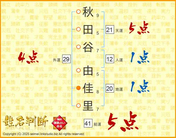 秋(9画)田(5画)谷(7画) 由(5画)佳(8画)里(7画)
