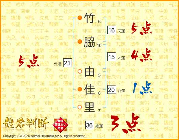 竹(6画)脇(10画) 由(5画)佳(8画)里(7画)