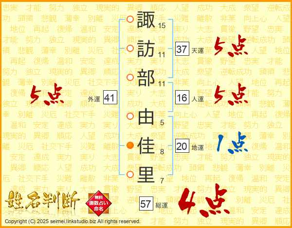 諏(15画)訪(11画)部(11画) 由(5画)佳(8画)里(7画)