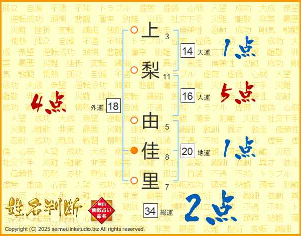 生活面を象徴する運勢です。外部から受ける影響力を表し、結婚運、家庭運や職場、環境への順応性を表します。総運から人運を引いた画数。姓や名が1文字の場合を除く。