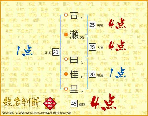 古(5画)瀬(20画) 由(5画)佳(8画)里(7画)