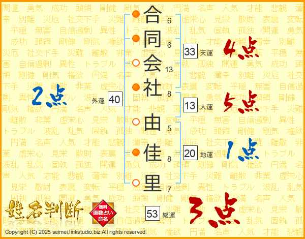 合同会社由佳里さんの総運は53画の3点!
