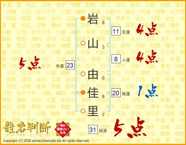岩(8画)山(3画) 由(5画)佳(8画)里(7画)