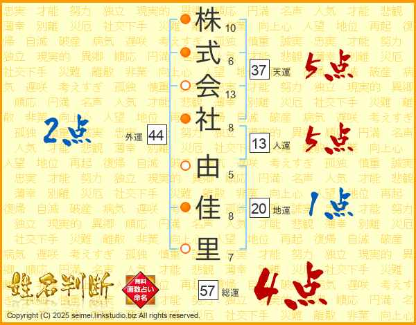 株(10画)式(6画)会(13画)社(8画) 由(5画)佳(8画)里(7画)