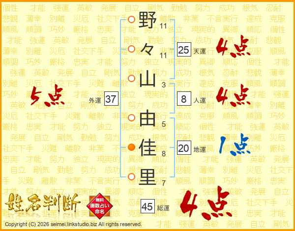 野々山由佳里さんの総運は45画の4点!