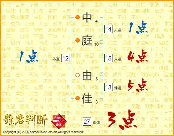 生活面を象徴する運勢です。外部から受ける影響力を表し、結婚運、家庭運や職場、環境への順応性を表します。総運から人運を引いた画数。姓や名が1文字の場合を除く。