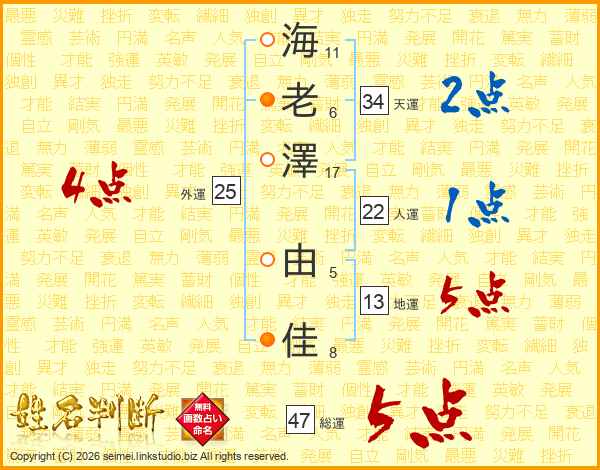 海(11画)老(6画)澤(17画)  由(5画)佳(8画)