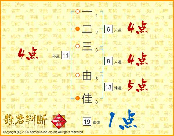 生活面を象徴する運勢です。外部から受ける影響力を表し、結婚運、家庭運や職場、環境への順応性を表します。総運から人運を引いた画数。姓や名が1文字の場合を除く。