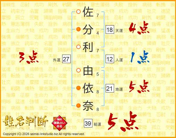 佐(7画)分(4画)利(7画) 由(5画)依(8画)奈(8画)