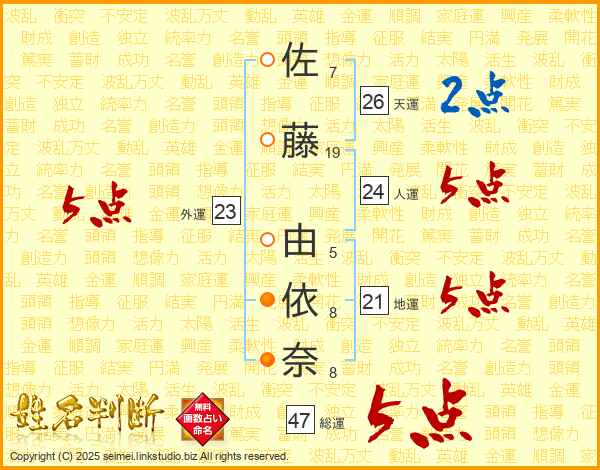佐(7画)藤(19画) 由(5画)依(8画)奈(8画)