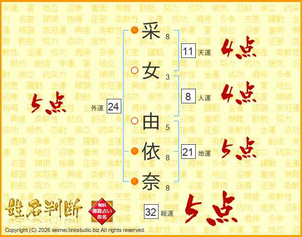 采(8画)女(3画) 由(5画)依(8画)奈(8画)