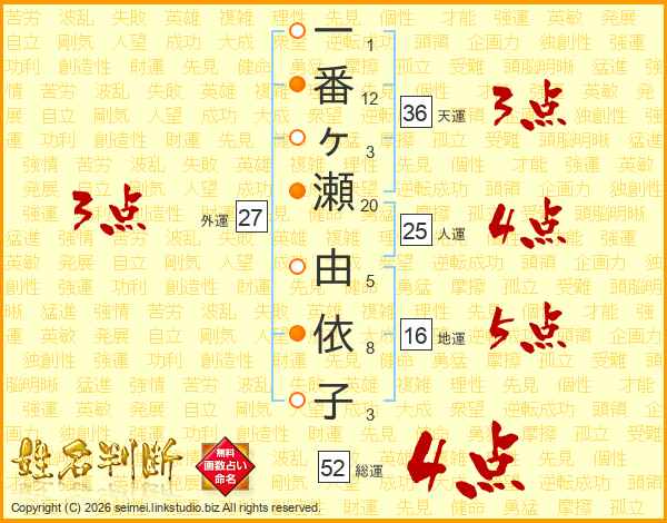 一番ヶ瀬由依子さんの総運は52画の4点!